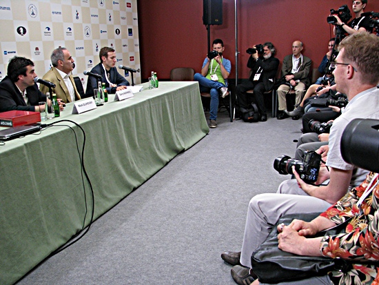 Leichtes Fibrieren war im ganzen Presseraum zu spüren, als der Meister am Tisch neben Mark Gluhosky und Dolmetcher Andrey Yakovlev Platz nahm und gleich losnagelte. Kurze Fragen beantwortete er ausführlich. Unangenehme, aus der Ecke der indischen Journalisten, polemisch und ziemlich undiplomatisch, man sei hier schließlich in der Hauptstadt des Schachs und nicht irgendwo in der Welt.