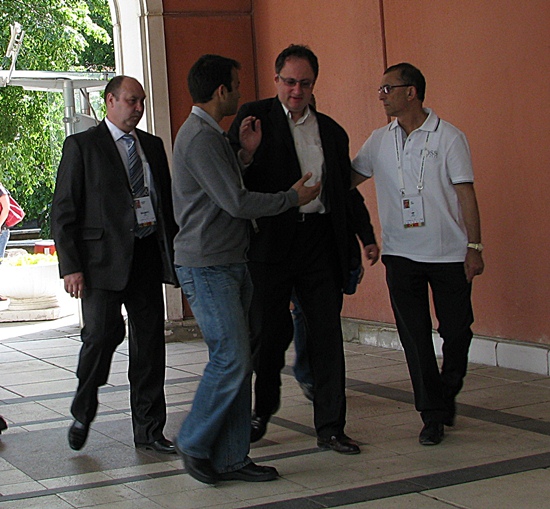... und der ganze Stab von Herausforderer Boris Gelfand rückte wieder an und klatschte sich vorm Eintritt in die Einsamkeit des Spielers ab!