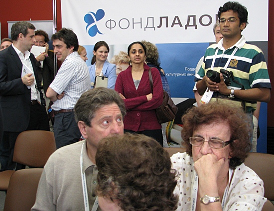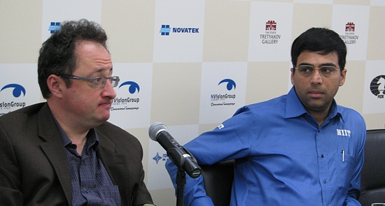 Boris Gelfand und Viswanathan Anand in der ruhigen Pressekonferenz - die Presseleute offensichtlich schockiert von dieser kuriosen Partie - das geht doch garnicht, das Boris so eine großartige Partie gestern spielt und heute so untergeht.