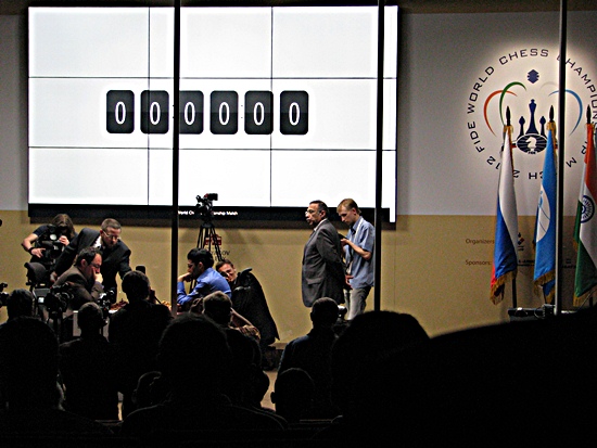 Boris Gelfand tigert unentwegt herum, und Tiger Anand sitzt da wie ein indischer Buddha, in sich ruhend und ohne jegliche Bewegung. Nur ab und zu rutscht er auf dem Stuhl herum, als würde er ihm zu heiß sein. Apropos, er kommt überhaupt nicht zum Kaffee holen - Hal Bond muss ihn bringen.