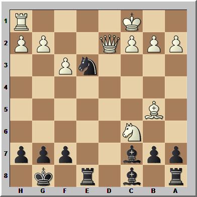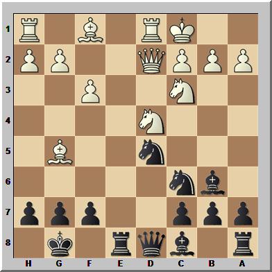 In dieser Stellung spielte Schwarz 11...Sxc3!? und opferte so seine Dame. Zwar stellte sich nach weiter 12.Lxd8 Sxd1 13.Lxc7 Lxc7 14.Sxc6 Se3 15.Lb5! heraus, dass Weiß (klar) besser steht, doch am Brett hatte der Anziehende in der Folge noch viele Probleme zu lösen.