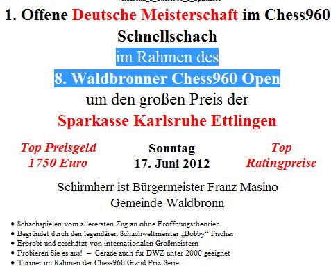 Chess960 1. Offene Deutsche Meisterschaft im Chess960... ...im Rahmen des 8. Waldbronner Chess960 Open am 17. Juni