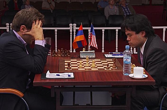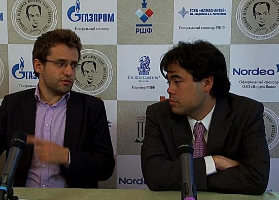 08.06.2012 - Der Startschuss zum z. Tal Memorial fiel eigentlich schon gestern mit einem Blitzturnier, in welchem die Startnummern für das heute begonnene Hauptturnier ausgespielt wurden. Es siegte übrigens Alexander Morozevich nach Zweitwertung mit 6,5/9 vor dem punktgleichen Magnus Carlsen. Eine "deutsche Tabelle" nebst Partien erhalten Sie bei ChessBase. Der Auftakt des 7. Tal Memorials verspricht einen spannenden Verlauf. Die kürzeste Partie lieferten Magnus Carlsen und Vladimir Kramnik. Der Russe erspielte sich als Schwarzer eine gute Stellung gegen die Nummer 1 der Weltrangliste, doch bei knapper werdender Zeit traute er sich nicht, aufs Ganze zu gehen und entschied sich nach nur 23 Zügen für eine dreifache Zugwiederholung. Den ersten vollen Punkt erzielte Teimour Radjabov, welcher Evgeny Tomashevsky das Nachsehen gab. Einige Zeit später hatte auch Levon Aronian gegen Hikaru Nakamura ein klar gewonnenes Turmendspiel auf dem Brett und verwertete sicher. Der nächste Sieg gelang Alexander Morozevich gegen Fabiano Caruana. Nach fast sechs Stunden entschied der weiße Freibauer auf der a-Linie die Partie. Den vierten Weißsieg des Tages machte dann wenig später Alexander Grischuk gegen Luke McShane perfekt. Die zweite Runde beginnt am Samstag um 13:00 Uhr.