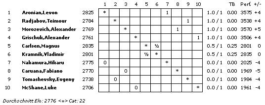 Mit einem ELO-Schnitt von 2776,4 wird hauchdünn die Turnierkategorie 22 erreicht. Remisangebot sind nicht vor Vollendung des 40. Zuges gestattet.