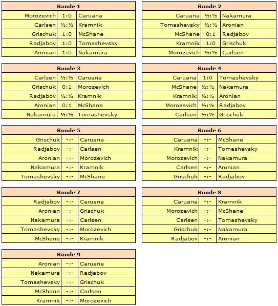 Mit einem ELO-Schnitt von 2776,4 wird hauchdünn die Turnierkategorie 22 erreicht. Remisangebot sind nicht vor Vollendung des 40. Zuges gestattet.