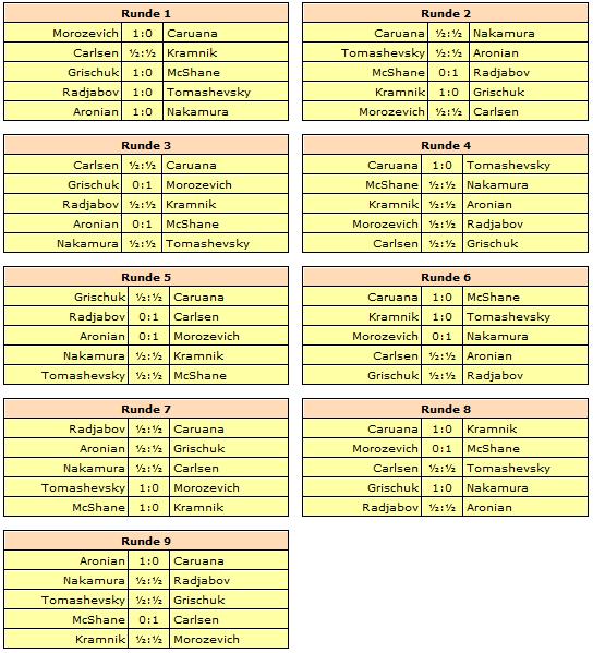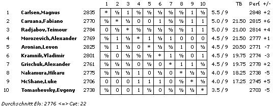 Mit einem ELO-Schnitt von 2776,4 wurde hauchdünn die Turnierkategorie 22 erreicht. Remisangebote waren nicht vor Vollendung des 40. Zuges gestattet.