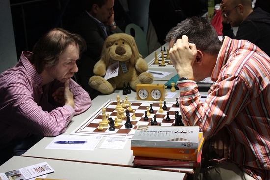 Als sich in der vierten Runde die Spitzenspieler ans Brett begaben, stellten sich viele aufmerksame Beobachter die berechtigte Frage: "Wo ist Igor?" Tja, der Großmeister war anderweitig verpflichtet und musste daher seine Partie gegen IM Sven Telljohann nachspielen. Das tat er wenig später im Training Center der Chess Tigers in Bad Soden und gab dort - weit weg von den sonst zahlreichen Kiebitzen - den einzigen halben Punkt ab. Dennoch wurde am vierten Spieltag in Kalbach auch ohne Khenkin interessantes Schach geboten. So versuchte am Spitzenbrett IM Erik Zude als Schwarzer gegen FM Oliver Uwira das berühmte Damenopfer Bronsteins in der Sämisch-Variante des Königsinders und ... verlor nach spannendem Verlauf. Für viele war dies die Partie der Runde, doch das Los sollte letztlich eine andere bestimmen.