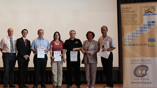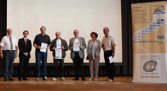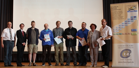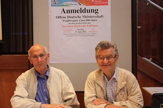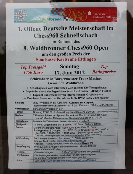 24.06.2012 - Ganz genau eine Woche ist es her, da veranstaltete der Schachclub Waldbronn das 8. Waldbronner Chess960 Open und hatte es zuvor kurzerhand gleich mal als 1. Deutsche Meisterschaft im Chess960 Schnellschach ausgeschrieben. Mit 36 Teilnehmern kamen dieses Mal zwar noch nicht ganz so viele Schachfreunde, wie man es sich erhofft hatte, doch qualitativ konnte sich das Feld durchaus sehen lassen. Mit Klaus Bischoff und Viesturs Meijers waren die beiden Großmeister Favoriten auf den Titel, aber FM Josef Gheng schlug ihnen ein Schnippchen und siegte denkbar knapp mit 6 aus 7 und einem Buchholzpunkt vor Bischoff. Gheng sicherte sich damit nicht nur den ersten offiziellen deutschen Chess960-Titel, er schnappte sich auch mit 500,- Euro den großen Preis der Sparkasse Karlsruhe Ettlingen - dem Hauptsponsor der Veranstaltung. Dritter wurde IM Dr. Oswald Gschnitzer nach Zweitwertung vor dem punktgleichen FM Igor Zuyev. Insgesamt war es ein erfolgreicher und historischer Tag für Chess960, der unbedingt nach einer Wiederholung schreit!