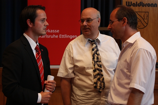 Alexander Binder von der Sparkasse Ettlingen (Leiter des Bereichs Waldbronn) im Gespräch mit Holger Moritz und Clemens Linowski. Wer weiß, vielleicht erhöht man ja im nächsten Jahr nochmals den Preisfonds, um mehr Spieler anzulocken!?