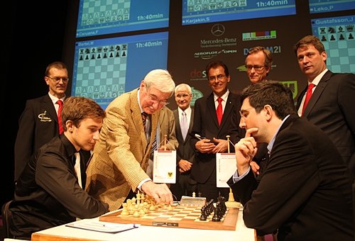 13.07.2012 - Beinahe wäre die erste Runde des 40. Sparkassen Chess-Meeting in Dortmund zu einer aus deutscher Sicht perfekten geworden. Während Georg Meier aus der Eröffnung heraus den Polen Mateusz Bartel dominierte und schlug, remisierten im deutschen Duell Daniel Fridman und Jan Gustafsson. Nun hätte nur noch Arkadij Naiditsch gegen Fabiano Caruana gewinnen müssen, aber die deutsche Nummer 1 verpasste in hochgradiger Zeitnot die goldene Chance. Dabei muss man so ehrlich sein und zugeben, dass es lange Zeit eher nach einem Sieg des Italieners aussah und dieser erst kurz vor der Zeitkontrolle patzte. Und weil die anderen Begegnungen zwischen Sergey Karjakin und Vladimir Kramnik sowie Peter Leko gegen Ruslan Ponomariov unentschieden endeten, führt zum Auftakt Meier die Tabelle an. Die zweite Runde beginnt am Samstag um 15:00 Uhr.