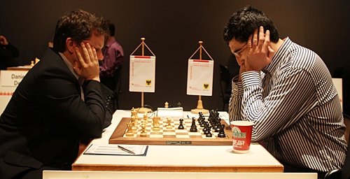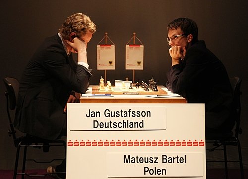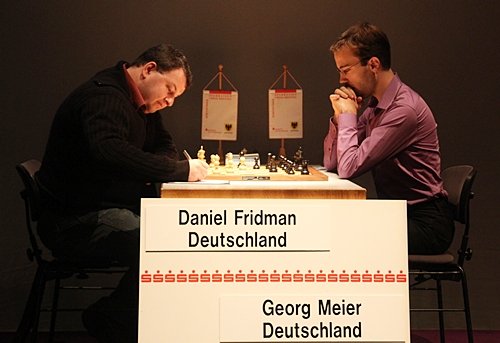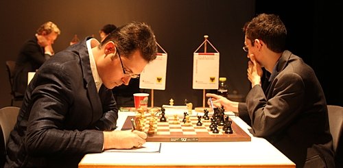 16.07.2012 - Die heutige vierte Runde des 40. Sparkassen Chess-Meeting in Dortmund endete etwas unbefriedigend mit fünf Unentschieden. Dabei wurde durchaus anständig um die Punkte gerungen, aber außer Peter Leko gegen Fabiano Caruana konnte sich niemand einen entscheidenden Vorteil erspielen. Zu seinem Leidwesen verpasste der Ungar jedoch bei knapper Bedenkzeit eine gute Möglichkeit und musste nach 42 Zügen ins Remis einwilligen. Wer die Spieler übrigens gerne mal treffen und eine Signatur haben möchte, kommt am Mittwoch um 15:00 Uhr in das Kundenzentrum der Sparkasse Dortmund (Freistuhl 2)!