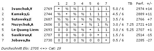 23.07.2012 - Mit beeindruckenden 5 aus 6 hat Vassily Ivanchuk in Amsterdam die Golden Classic gewonnen. Das erste Turnier mit Hängepartien seit rund 20 Jahren wurde zum Leidwesen des Ukrainers (Performance von 2974!) zwar nicht ausgewertet, aber dafür strich er stolze 10.000,- US-Dollar ein. Immerhin noch 7.000,- durfte sich Gata Kamsky als Zweiter einstecken - dafür kämpfte der Amerikaner besonders in der Schlussrunde heroisch. Über 5.000,- für den dritten Rang darf sich der ursprüngliche Initiator des Turniers, Emil Sutovsky, freuen. Sehr stark waren bei dem ausgezeichneten Feld auch die 50 Prozent von Anna Muzychuk, welche theoretisch eine Performance von 2721 spielte und sich die 4.000,- mit echtem Kampfschach redlich verdient hat. Ob das Turnier nach einer Wiederholung schreit? Vom Schnitt und der Qualität der meisten Partien ja, aber Fakt ist auch: Hängepartien sind nach wie vor sowas von out!