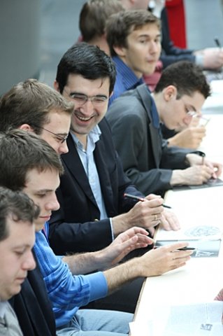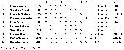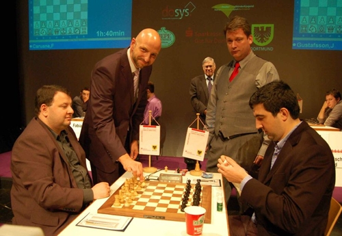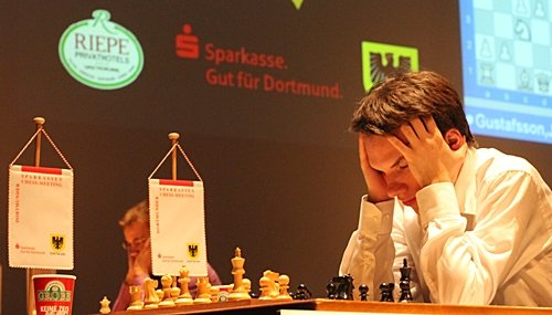 19.07.2012 - Am Mittwoch hatten die zehn Spieler des 40. Sparkassen Chess-Meeting in Dortmund ausschließlich zum Stift gegriffen und zahlreiche Autogramme gegeben, doch heute bekamen sie wieder Holzfiguren zu fassen und versuchten nach Kräften, möglichst einen vollen Punkt zu erzielen. Am besten gelang dies in der sechsten Runde Arkadij Naiditsch und Mateusz Bartel. Die deutsche Nummer 1 hielt sich an Landsmann Jan Gustafsson schadlos und zog so mit Vladimir Kramnik und Sergey Karjakin gleich, welche gegen Daniel Fridman beziehungsweise Peter Leko remisierten. Heraus gefallen aus der Führungsgruppe ist dagegen Ruslan Ponomariov, denn er verlor eben gegen Bartel. Zu guter Letzt trennten sich Fabiano Caruana und Georg Meier in einer spannenden Französisch-Partie friedlich. Die siebte Runde startet am Freitag um 15:00 Uhr.