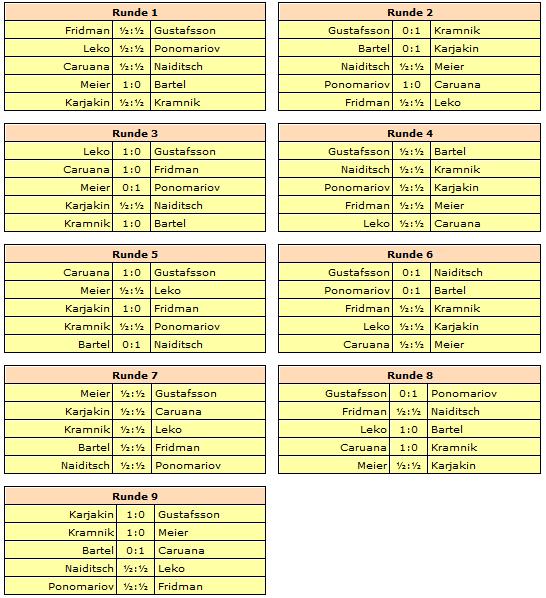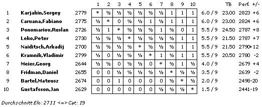 Die Bedenkzeit betrug 100 Minuten/40 Züge + 50 Minuten/20 Züge + 15 Minuten + 30 Sekunden/Zug ab dem ersten Zug.