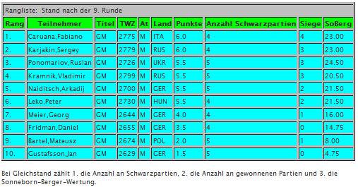 22.07.2012 - In einem Wimpernschlagfinale wurde die 40. Auflage des Sparkassen Chess-Meeting entschieden. Der Sieger heißt - aufgrund der höheren Zahl an gewonnenen Partie - Fabiano Caruana. Der Italiener schlug in der Schlussrunde Mateusz Bartel und hätte somit nur noch von Ruslan Ponomariov oder Arkadij Naiditsch abgefangen werden können. Doch Beide kamen gegen Daniel Fridman beziehungsweise Peter Leko nicht über ein Remis hinaus. Zwar siegte parallel Sergey Karjakin gegen Jan Gustafsson, aber der Wahl-Russe hat letztlich einen Sieg weniger auf dem Konto. Dritter wurde Ponomariov vor Vladimir Kramnik, der sich mit seinem Sieg gegen Georg Meier einen halbwegs tröstlichen Abschluss verschaffte. Bester Deutscher wurde auf Platz 5 und ohne Niederlage Arkadij Naiditsch.