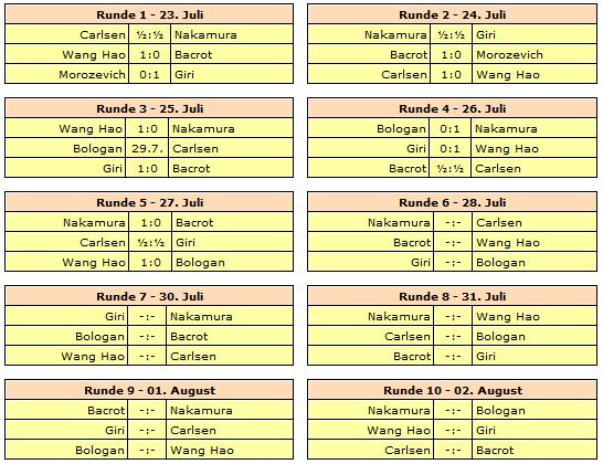 Leider musste Morozevich nach zwei Runden aus gesundheitlichen Gründen das Turnier verlassen. Seinen Platz nimmt Viktor Bologan ein. Die Partie der dritten Runde gegen Magnus Carlsen wird am 29. Juli nachgespielt.