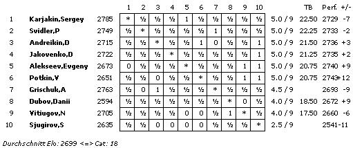 12.08.2012 - Das 65. Russische Superfinale der Männer in Moskau endete heute mit einer enttäuschenden Remisquote von 75,6 Prozent. Entsprechend landeten gleich sechs Spieler mit 5/9 auf dem geteilten ersten Rang, so dass ein weiteres Schnellschachturnier über den Sieg entscheiden muss. Eigentlich sollte der Tiebreak unbedingt noch heute stattfinden, aber dies ist bei der Menge an punktgleichen Spielern schlicht zu viel. Dem entsprechend wird morgen ab 10:00 Uhr ein Rundenturnier mit dem Modus 15 Minuten plus 10 Sekunden ausgetragen. Bei den Frauen setzte sich ohne Tiebreak mit einer im Vergleich zu den Männern nahezu umgekehrten Remisquote von 33,3 Prozent mit 6,5/9 Natalija Pogonina (Bild) durch. Zum Abschluss benötigte sie lediglich ein Remis gegen Baira Kovanova, welches selbige nach nur 11 Zügen per dreimaliger Stellungswiederholung erlaubte. Somit spielten die Konkurrentinnen frühzeitig nur noch um die Plätze. Den zweiten Rang teilen sich mit 5,5 Punkten Valentina Gunina und Nadezhda Kosintseva, wobei erstere die bessere Sonneborn-Berger-Wertung hat.