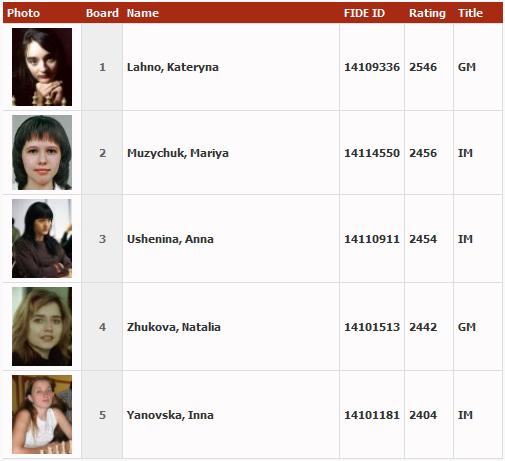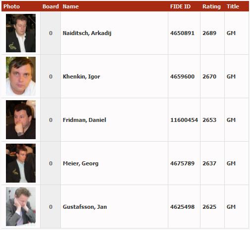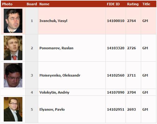 ...bietet ein breit gefächertes Feld an Favoriten, wobei Russland, Titelverteidiger Ukraine, Armenien, Aserbaidschan, China, USA, Israel und auch Ungarn nach Ansicht des Autors zu den heißesten Medaillen-Anwärtern zählen dürften. Immerhin, das sind ja schon mal acht Teams, welche wir Ihnen gerne auch nochmals mit Namen und Zahlen vorstellen möchten. Stören Sie sich nicht an der teils abenteuerlichen und mitunter fehlerhaften Schreibweise einiger Namen! Die Screenshots stammen von der türkischen Veranstalterseite, und bei so vielen Namen und Daten kann dies natürlich passieren. Auch sind die Ratingzahlen nicht wirklich aktuell, aber bei der Olympiade werden garantiert die korrekten Zahlen verwendet.