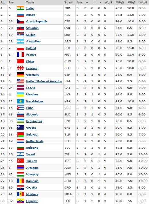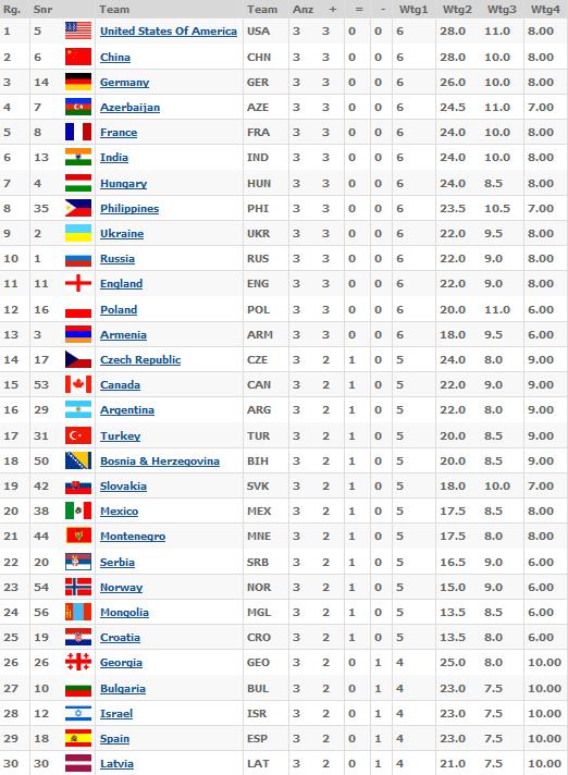 Bei Punktgleichheit entscheidet die Sonneborn-Berger-Wertung, wobei das niedrigste Ergebnis gestrichen wird. Sollte es nötig sein, entscheidet danach die Summe der Brettpunkte.