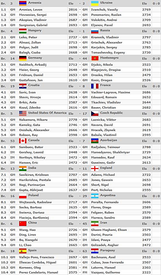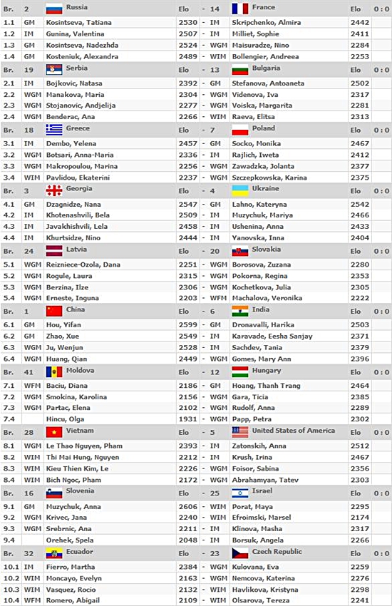 01.09.2012 - Armenien gegen die Ukraine und Ungarn gegen Russland, dies sollten in der heutigen fünften Runde der 40. Schacholympiade die absoluten Spitzenbegegnungen sein. Diese Teams haben in Sachen Mannschaftspunkte noch eine blütenweiße Weste. Direkt dahinter an Tisch Nr. 3 spielen allerdings schon unsere Jungs und zwar gegen Montenegro. Letztere schlugen in der vierten Runde immerhin die Griechen, weshalb Kapitän Uwe Bönsch seine Mannen sicherlich warnen wird, diese Aufgabe richtig ernst zu nehmen. Verwöhnt durch das bisher gute Spiel erwarten wir natürlich dennoch einen Sieg! Enger scheint es bei den deutschen Frauen gegen die Kubanerinnen zu sein, aber wir sind auch in diesem Duell Favorit und hoffen daher heute insgesamt auf 4 schwarzrotgoldene Mannschaftspunkte. An den vorderen Tischen sind besonders die Matches Russland gegen Frankreich, Georgien gegen Ukraine und China gegen Indien interessant. Wie gewohnt geht es um 14 Uhr los, und Chess Tiger GM Klaus Bischoff führt Sie ab ca. 14:30 Uhr live durch das Geschehen. In der Folge finden Sie die Spielerpaarungen für heute.