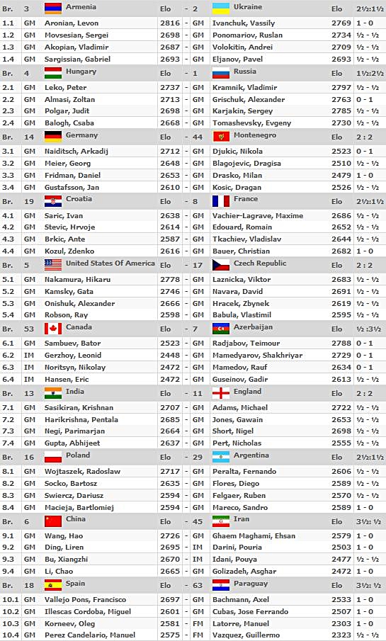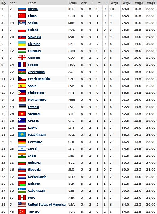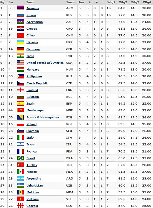Einen wichtigen Schritt gen Gold hat im Open Russland beim 2,5:1,5 gegen Ungarn gemacht. Bei drei Remisen erzielte Alexander Grischuk gegen Zoltan Almasi den entscheidenden Sieg. Ebenfalls güldene Träume werden so langsam die Armenier haben, denn sie besiegten den Titelverteidiger Ukraine ebenfalls mit 2,5:1,5. Levon Aronian schlug Vassily Ivanchuk und entschied damit das Match. Damit lässt sich auch ohne offizielle Auslosung für die sechste Runde am Montag das Duell Russland gegen Armenien (oder umgekehrt) prognostizieren. UPDATE: In der sechsten Runde bekommen es die Männer mit den starken US-Amerikanern zu tun, während die Frauen gegen die Inderinnen sicherlich nicht minder gefordert werden.