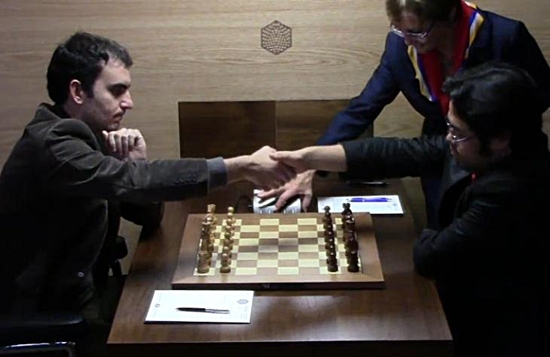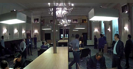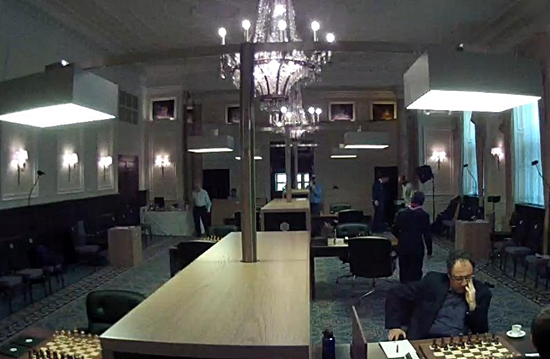 Blick in den leeren Spielsaal? Nein, unten rechts spielen bereits Shakhriyar Mamedyarov und Boris Gelfand! Die Partie begann aufgrund des jüdischen Feiertages Jom Kippur eine Stunde früher als die anderen.