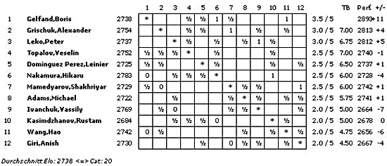 25.09.2012 - In der fünften Runde des FIDE Grand Prix ist absolut kein Blut geflossen. Alle Partien endeten, trotz teils verheißungsvollen Stellungen, im Remishafen und schraubten die Quote der unentschiedenen Partien auf schwindelerregende 80 Prozent hoch. Somit hat sich natürlich auch nicht in der Tabelle geändert. Es führt weiterhin Boris Gelfand mit einem halben Zähler Vorsprung vor Alexander Grischuk und Peter Leko. Am Mittwoch ist der erste von zwei Ruhetagen, bevor es am Donnerstag um 15 Uhr mit der sechsten Runde weitergeht.