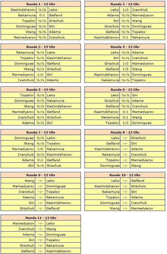 Rustam Kasimdzhanov brachte Vassily Ivanchuk bereits ganz früh in Bedrängnis, traute sich aber nicht, der Zugwiederholung auszuweichen. Und so steht unter dem Strich ein unbefriedigendes Remis nach nur elf Zügen!