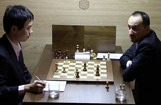 28.09.2012 - Nach sieben von elf Runden hat beim FIDE Grand Prix in London weiterhin Boris Gelfand die Nase klar vorn. Heute besiegte der israelische Vize-Weltmeister Michael Adams und liegt nun mit +3 prächtig im Rennen um den Turniersieg. Folgen kann ihm aktuell nur Shakhriyar Mamedyarov. Der Aserbaidschaner spielte eine starke Partie gegen Hikaru Nakamura und erzielte damit seinen zweiten Sieg in Serie, während der Amerikaner zum zweiten Mal in Folge verlor. Alle weiteren Partien endeten unentschieden, wobei besonders das elfzügige(!) Remis zwischen Vassily Ivanchuk und Rustam Kasmidzhanov (Bild) Fragen aufwarf. Fakt ist, dass der Ukrainer als Weißer die Eröffnung zumindest fragwürdig behandelte, dadurch einen Bauern weniger hatte und dann dem verdutzten Usbeken eine Zugwiederholung anbot, welche dieser annahm. Wenn Sie mehr wissen wollen, sollten Sie sich Kasimdzhanovs rund fünfminütige Erklärung im Video-Interview mit Macauley Peterson anhören. Am Samstag steht um 15 Uhr die achte Runde an.
