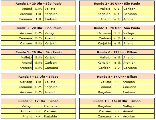 Rundenstart in São Paulo ist jeweils 20:00 Uhr unserer Zeit. Am 27. September wird ein Ruhetag eingelegt. In Bilbao dann wird jeweils um 17:00 Uhr gespielt, nur die letzte Runde wird bereits um 16:30 gestartet. Am 10. Oktober wird geruht.