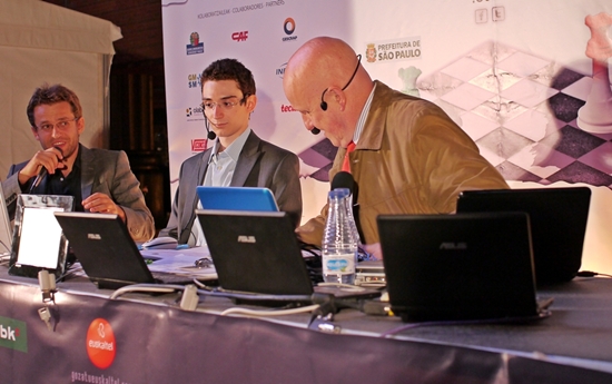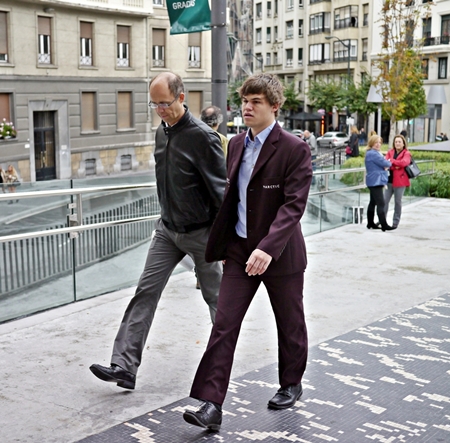 12.10.2012 - Die neunte Runde beim Grand Slam Masters Final in Bilbao sah heute alle drei Anziehenden klar im Vorteil. Den Anfang machte Magnus Carlsen mit seinem sehenswerten Sieg gegen Weltmeister Viswanathan Anand. Damit brachte der Norweger Co-Leader Fabiano Caruana quasi in Zugzwang, doch dieser ließ sich nicht lumpen und besiegte Levon Aronian. Damit haben Carlsen und Caruana vor der Schlussrunde jeweils 16 Punkte und können von der übrigen Konkurrenz nicht mehr eingeholt werden. Das vermeintlich leichtere Los hat zum Abschluss der Italiener, denn er trifft auf Francisco Vallejo, der heute Sergey Karjakin unterlag. Carlsen bekommt es mit Aronian zu tun. Die letzte Runde beginnt bereits um 16:30 Uhr. Unser heutiger Bericht wird mit zahlreichen Bildern unseres Chess Tigers on Tour Eric van Reem garniert.