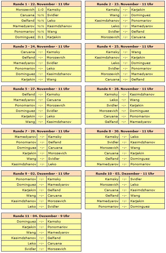 Gespielt wird ein elfrundiges Rundenturnier mit zwölf Spielern. Rundenstart ist täglich um 11:00 Uhr unserer Zeit, lediglich die letzte Runde beginnt bereits um 9:00 Uhr. Am 26. November und 01. Dezember wird jeweils ein Ruhetag eingelegt.