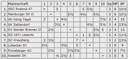 Nord: Hier bewerben sich noch 3 Klubs mit vollem Punktekonto um den Aufstieg in die Hessenliga. Niederbrechen auf Rang 3 ist dabei die Überraschung der Liga, und auch Wiesbaden an der Spitze nach Brettpunkten hätte man nicht unbedingt hier erwartet, da Korbach die Pfeile nicht im Köcher lässt, sondern die spielstarken GMs auch in die Aufstellung bringt. Das Spitzenduell um den Aufstieg steigt jedenfalls im Januar.