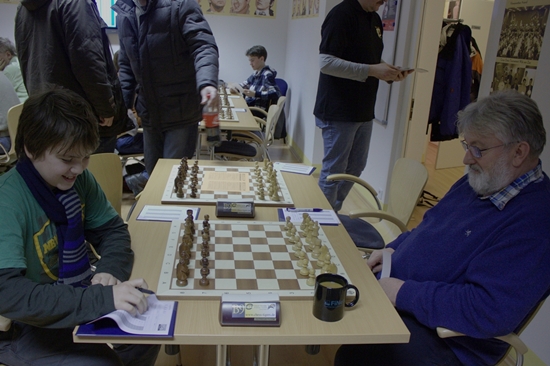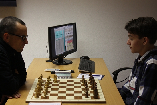 Papa Andreas Weber (links) erreichte mit Geschick und etwas Glück ein Remis gegen Michael Budde und gewann die Ratinglasse 2
