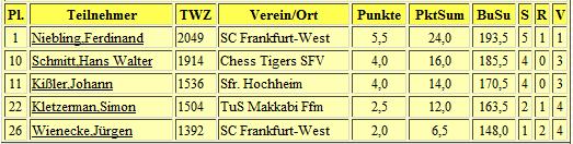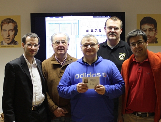 18.12.2012 - Als Tabellenführer FM Behrang Sadeghi im Wissen, dass ihm ein halber Punkt zum Turniersieg genügen würde, seinem Gegner Ferdinand Niebling bereits im ersten Zug das Remis anbot, lehnte dieser ungerührt ab, indem er seinen Zug machte. Wie sich später herausstellte, hatte er das Remisangebot schlicht nicht gehört! Dies sollte sich im weiteren Partieverlauf als sein Glück herausstellen. Lange Zeit gestaltete sich das Geschehen offen, doch im Endspiel erarbeitete sich der Nestor leichte Vorteile und brachte den weißen Monarchen in latente Mattgefahr. Unter diesem Druck brach der Fidemeister überraschend schnell zusammen, indem er seinen Turm einstellte. Damit ist Niebling mit 77 Jahren der dritte Frankfurter Chess960-Stadtmeister, obwohl am Nebenbrett Mike Rosa ebenfalls siegen konnte und somit - als einziger Spieler ungeschlagen - auch 5,5 Punkte vorzuweisen hat. Doch die Fortschrittswertung sieht den Oldie im Vorteil, und nicht nur der Zweitplatzierte gönnt ihm das von ganzem Herzen. Sadeghi blieb "nur" der dritte Rang und die Erkenntnis, dass man Nestoren ruhig etwas lauter Remis bieten sollte. Der Dank sämtlicher Teilnehmer gilt Hans-Walter Schmitt und dem Chess Tigers Training Center für perfekte Spielbedingungen und natürlich dem hessischen Bezirk 5 (vertreten durch den Vorsitzenden Thorsten Ostermeier) sowie Hans-Dieter Post für eine gewohnt souveräne Turnierleitung.