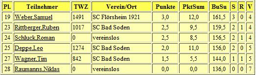 Leo spielte über weite Strecken des Turniers sehr stark, doch mangelnde Erfahrung und schlechtes Zeitmanagement ließen ihn noch zu viele Punkte verschenken. Aber wenn er am Ball bzw. am Brett bleibt, wird er schon bald ein gefürchteter Turnierspieler werden!