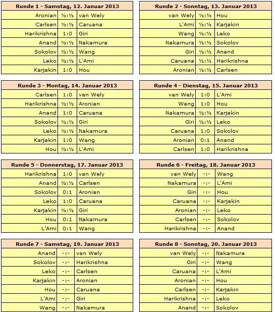 Rundenstart ist jeweils um 13:30 Uhr, lediglich die letzte Runde am 27. Januar beginnt bereits um 12:00 Uhr. Ruhetage werden am 16., 21. und 24. Januar eingelegt.