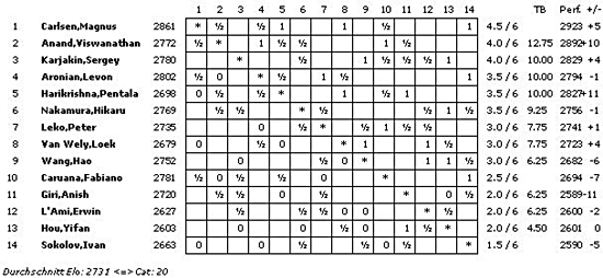 Die A-Gruppe erreicht mit einem ELO-Schnitt von 2732 die Kategorie 20 (2012: 2754/21; 2011: 2739/20), die B-Gruppe 2620 und Kategorie 15 (2012: 2602/15; 2011: 2658/17) und die C-Gruppe 2476 und Kategorie 10 (2012: 2454/9; 2011: 2507/11).