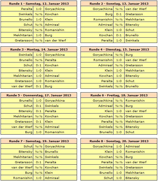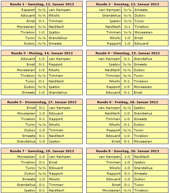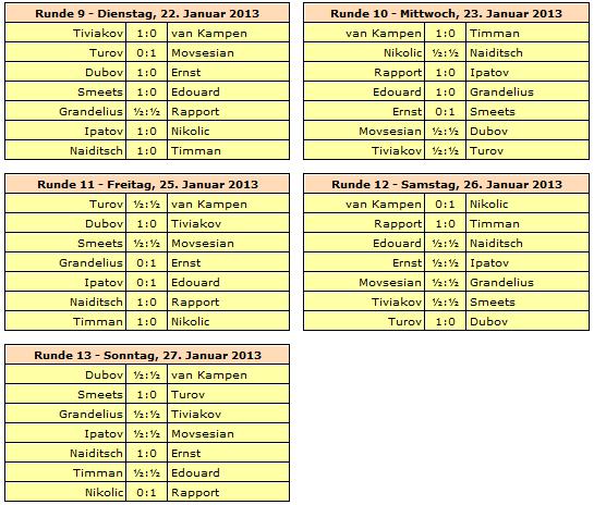Aber der stets freundliche Mov ließ im weiteren Verlauf die Zügel etwas schleifen, während Rapport und Naiditsch unverdrossen auf das große Ziel hin spielten. In der elften Runde dann folgte das entscheidende Duell zwischen Naiditsch und Rapport, welches ersterer für sich entschied. Zwei Runden vor dem Ende sah es so aus, als wäre für Rapport das Rennen verloren. Aber mit zwei Siegen zum Abschluss übertrumpfte er Naiditschs 1,5 und Movsesians 1,0.