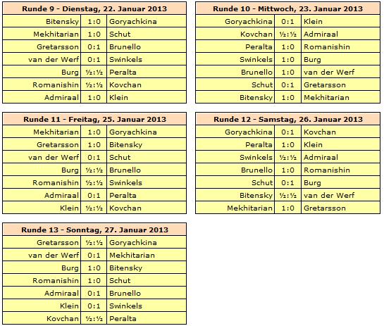 Zum ganz großen Wurf reichte es nicht, die bessere Wertung sprach für Naiditsch, der in der Schlussrunde gegen Sipke Ernst ein Damenendspiel gewann, welches die Tablebase zum Remis degradiert. Tja, auf Schatten folgt halt immer auch Licht, wenn auch nicht immer so prompt und süß wie bei Arkadij Naiditsch. Wir wünschen ihm schon jetzt viel Spaß beim Tata Steel 2014! Und wer weiß, vielleicht lassen sich die Veranstalter ja noch dazu hinreißen, Richard Rapport ebenfalls zu befördern. Es wäre nicht das erste Mal und verdient hätte es der 16-Jährige auf jeden Fall.