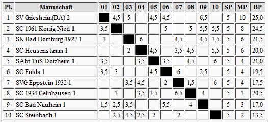 Fast zwei Monate sind vergangen seit der letzten Verbandsrunde, aber die Spieler von Tabellenführer Griesheim haben nichts verlernt. Knapp ging's aus gegen Fulda, doch die zwei Punkte klingeln erst mal in der Tabellenkasse. Nied hält nach dem Derby-Sieg gegen Steinbach den Anschluss, doch es bleibt nur die Hoffnung auf einen Ausrutscher des Ersten. Bad Homburg und Heusenstamm haben nüchtern betrachtet erst mal nur den abstiegsbedrohten Rest separiert, denn ab Platz 5 ist man nur 2 Punkte vom Tabellenende entfernt. Schafft es Steinbach doch noch, die rote Laterne abzugeben?