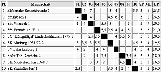 Zu ihm an die Spitze gesellte sich so noch Thomas Renner vom SV Frankfurt Nord, der in der Schlußrunde überraschend gegen IM Boris Margolin vom SV Oberursel gewinnen konnte, und diesen damit auf Platz 6 verwies. Renner wurde damit auch Bester des Bezirks Frankfurt!