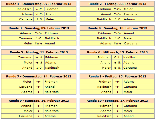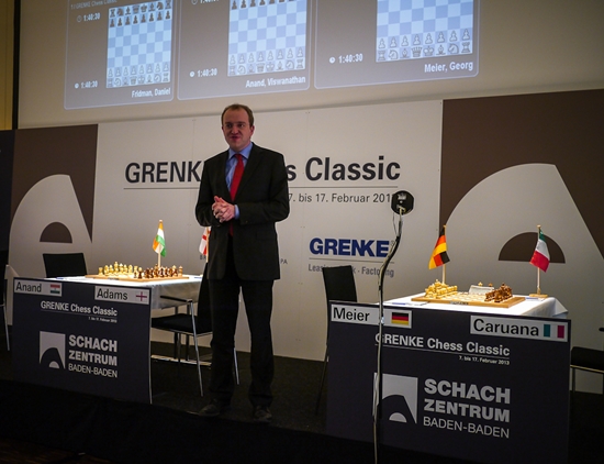 13.02.2013 - "This guy is on fire!", lautete das Lob von Weltmeister Viswanathan Anand Richtung Arkadj Naiditsch beim heutigen Pressetermin nach der eigenen Partie gegen Michael Adams. Auch nach sechs Runden GRENKE Chess Classic hat die deutsche Nummer 1 nur ein Remis auf dem Konto, welches aus der ersten Runde gegen Daniel Fridman stammt. Selbiger kam heute allerdings nicht nochmals so glimpflich davon, Der Deutsche Meister wurde von einem bis in die Haarspitzen auf Randale eingestellten Naiditsch von Beginn an hart rangenommen. Gut möglich, dass Fridman sogar mal besser stand, aber im Naiditschen Königsangriff brach er dann doch zusammen und konnte trotz beharrlicher Gegenwehr seine erste Niederlage nicht abwenden, was nicht zuletzt an 37...d5!! lag. Dagegen verblassten die beiden anderen Partien etwas. Georg Meier erarbeitete sich gegen Fabiano Caruana allerbeste Gewinnchancen, aber der Italiener erwies sich als zu schlüpfrig für den Deutschen und entglitt ins Remis. Unterdessen waren Anand und Adams bereits zum Dinner, denn ihr Spanier hatte sich recht zeitig als zu blutarm erwiesen, um einen Sieger zu ermitteln. Daher führt weiterhin Caruana mit einem halben Punkt mehr als Anand und Naiditsch. In der siebten Runde könnte im Duell zwischen dem Tabellenführer und dem Weltmeister eine kleine Vorentscheidung fallen. Ab 15:00 Uhr geht's los.