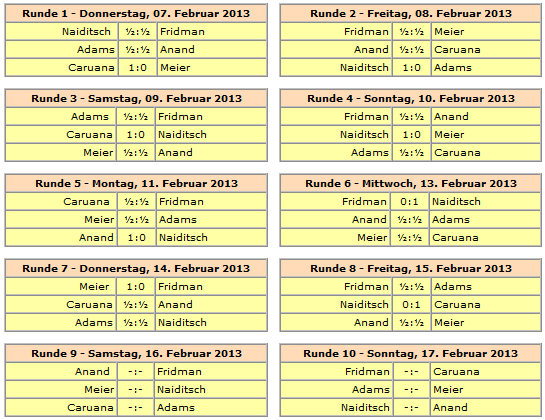 Rundenstart ist jeweils um 15:00 Uhr, lediglich die letzte Runde am 17. Februar beginnt bereits um 13:00 Uhr. Der einzige Ruhetag wird am 12. Februar eingelegt.
