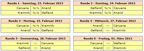 25.02.2013 - Unter den Augen von Gast-Kommentator Garry Kasparov kämpften in einem Najdorf-Sizilianer mit frühem 6.h3 und 7.g4 Viswanathan Anand und Boris Gelfand in der dritten Runde der Zürich Chess Challenge 2013 ein Duell mit offenen Visieren. Im Mittelspiel schien der Weltmeister Vorteil zu haben, und er gewann auch einen Bauern, doch Gelfand erreichte letztlich ein haltbares Turmendspiel. Hochklassig war auch die Partie zwischen Fabiano Caruana und Vladimir Kramnik. Die russische Nummer 2 der Welt versuchte sich seit langer Zeit mal wieder an Benoni und leitete so ein munteres Spielchen mit vielen taktischen Scharmützeln ein. Doch es half alles nichts, auch diese Partie endete friedlich. Somit liegt die Remisquote zur Halbzeit beim hundert Prozent. Davon können sich die Spieler am Dienstag erholen. Die Rückrunde beginnt am Mittwoch um 15 Uhr.