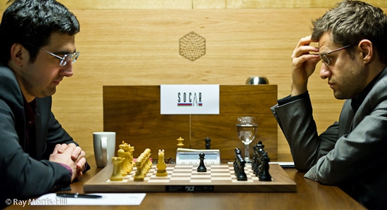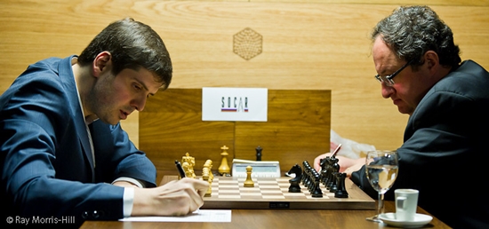 20.03.2013 - Man, man, das war eine wirklich tolle fünfte Runde beim Kandidatenturnier in London! In allen vier Partien ging früher oder später mächtig die Post ab, und es hätte gut und gerne ohne ein einziges Remis enden können. Doch der Reihe nach: Zwischen Peter Svidler und Boris Gelfand wurde es schon aus der Eröffnung heraus heiß. Der Israeli wagte es tatsächlich, als Schwarzer die Leib und Magen-Eröffnung seines Gegners - Grünfeldindisch - zu spielen und geriet in Rekordzeit in Nachteil. Doch in der Folge verbrauchte Svidler nach eigener Aussage an den falschen Stellen zu viel Zeit und verlor dann den Faden. Nach dem Friedensschluss haderte der St. Petersburger sehr mit seinen vergebenen Chancen. Auch bei Vassily Ivanchuk gegen Magnus Carlsen kam Weiß bestens aus der Eröffnung, doch Chucky kann momentan offenbar nicht mit der Bedenkzeit umgehen und schenkte seinen Vorteil in Zeitnot wieder her. Als Carlsen kurz vor der ersten Zeitkontrolle gar noch das Remisangebot ablehnte, schlug er beinahe dem Fass den Boden aus. Dafür kritisierte sich der Norweger in der Pressekonferenz selbst sehr heftig, denn so hätte er sich einen unnötigen Kampf um den halben Punkt ersparen können. Kein Bisschen weniger spannend war das Remis zwischen Vladimir Kramnik und Levon Aronian. Im Mittelspiel erspielte sich der Russe großen Vorteil, übersah dann jedoch einen guten Gewinnweg, und Aronian konnte ausgleichen. Doch der Armenier machte es nochmals spannend und musste schließlich seine ganzen Verteidigungskünste bemühen, um wirklich ins Remis zu entkommen. Last but not least trennten sich Alexander Grischuk und Teimour Radjabov ohne einen Sieger. Der Aseri gab - nachdem er zwischenzeitlich mal kritisch stand - eine Figur für drei Bauern und spielte damit auf Sieg, doch sein russischer Gegenüber fand den schmalen Grat zur Punktteilung. Somit hat sich trotz einer klasse Runde natürlich nichts am Tabellenstand geändert. Die sechste Runde findet am Donnerstag um 15 Uhr statt.