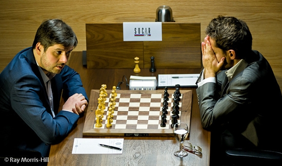 28.03.2013 - Gegen Alexander Grischuks originelle Eröffnungsbehandlung glich Magnus Carlsen mit Schwarz in der elften Runde des Kandidatenturniers zwar aus, aber mehr rechnete sich der Führende nicht aus, und so ward nach 23 Zügen der Punkt geteilt. Damit behält Carlsen mit 7,5 Punkten die alleinige Führung, doch der direkte Verfolger hat sich geändert. Vladimir Kramnik stellte Teimour Radjabov eine taktische Falle und der völlig außer Form agierende Aseri tappte voll hinein. Damit hat Kramnik 7 Punkte, während Levon Aronian dieses Mal deutlich zu viel Risiko gegen Peter Svidler einging und von dem Russen folgerichtig bestraft wurde. Dennoch ist der Armenier mit 6,5 Punkten und drei ausstehenden Runden noch nicht gänzlich aus dem Rennen. Die morgige Begegnung mit Kramnik könnte aus dem Dreikampf an der Spitze ein Duell machen. Nicht der Rede wert war übrigens das Remis zwischen Vassily Ivanchuk und Boris Gelfand nach nur 17 Zügen. Freuen wir uns lieber auf die zwölfte Runde am Karfreitag - wie gewöhnlich ab 15 Uhr.