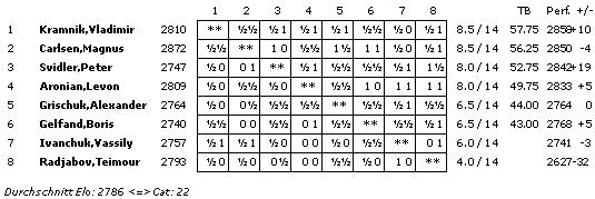 Die Bedenkzeit betrug 120 Minuten für 40 Züge, 60 Minuten für weitere 20 Züge und 15 Minuten für den Rest der Partie. Zusätzlich gab es ab dem 61. Zug 30 Sekunden Bonus pro ausgeführten Zug.