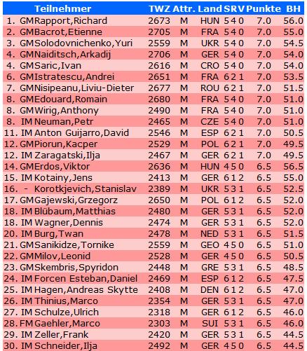 Das 17. Int. Neckar-Open sah nach der 9. Runde ein totes Rennen. Gleich 13 Spieler teilen sich mit 7,0 Punkten den 1. Platz. Der glückliche Sieger nach Wertung heißt Richard Rapport. Der 17-jährige Ungar ist ein verdienter Sieger, denn er spielte ein sehr souveränes Turnier ohne ein Mal in Verlustgefahr zu geraten. Auf den 2. Platz landete Etienne Bacrot vor Yuri Solovnichenko.