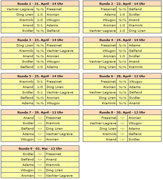 Gespielt wird ein neunrundiges Rundenturnier mit zehn Spielern. Rundenstart in Paris ist täglich um 14 Uhr und in St. Petersburg 12:00 Uhr unserer Zeit, was wohl auch für die letzte Runde gilt. Zwei Ruhetage werden eingelegt und zwar direkt hintereinander. Das heißt, am 26. und 27. April haben die Spieler genügend Zeit für die Reise von Frankreich nach Russland.